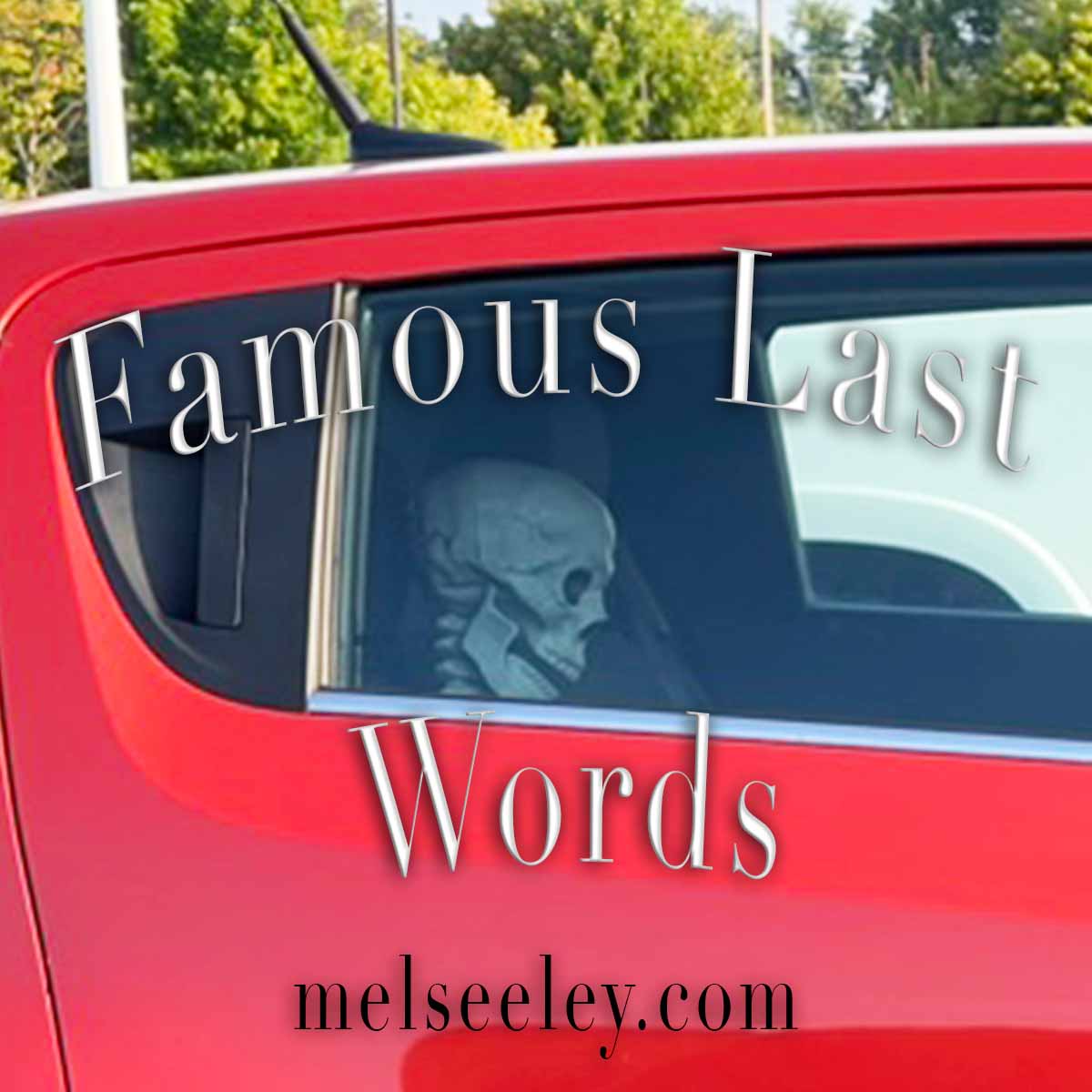 After getting over my initial surprise at seeing a skeleton in the back of a car, nowhere near Halloween, I started to drive away. I made it maybe 100 feet before all the events of the day came together in my mind. The man saying, ‘I’ll be just a minute.’ Parked next to the cart corral. My reply, “Famous LAST words.” A skeleton, not a person, sitting in the car next to me. ‘Famous LAST words.’ And then, my brain exploded just a little bit.